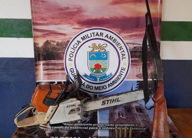 Com ele também foi encontrada uma espingarda calibre 32 municiada com um cartucho e havia mais três munições do mesmo calibre sem documentação. A arma, munições e a motosserra foram apreendidas.