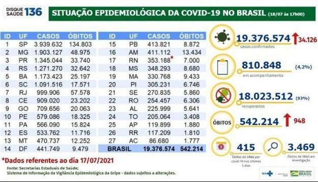 O Brasil registrou, em 24 horas, 34.126 novos casos de covid-19, segundo boletim divulgado pelo Ministério da Saúde. No total, o país acumula 19.376.574 casos desde o início da pandemia e há, segundo o Boletim Epidemiológico divulgado neste domingo (18), 18.023.512 de pessoas que se recuperaram da doença.