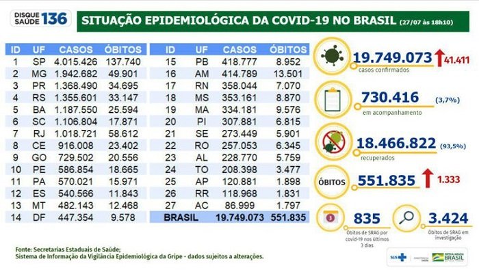 Covid-19: Brasil tem 19,7 milhões de casos e 551,8 mil mortes