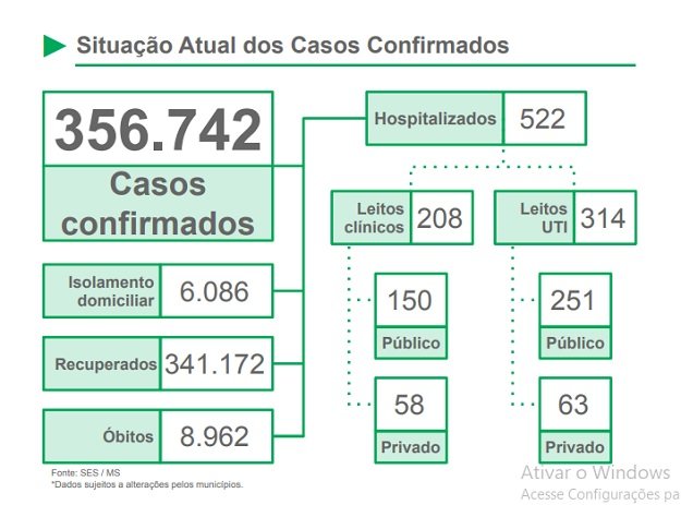 De 356.742 casos confirmados em MS, 341.172 pacientes se recuperaram. Em relação às internações, MS tem 522 pacientes internados. Destes, 208 estão em leitos clínicos (150 públicos e 58 privados) e 314 em leitos de UTI (Unidade de Terapia Intensiva), dos quais 251 estão em leitos públicos e 63 em privados.