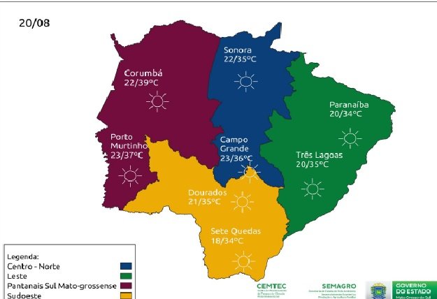 Será mais um dia com grande amplitude térmica no Estado, com a temperatura mínima estimada em 16°C e máxima podendo chegar aos 39°C durante a tarde na região sudoeste e pantaneira. Na capital a máxima pode chegar aos 34°C.