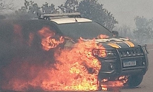 Uma viatura da PRF (Polícia Rodoviária Federal) ficou destruída em incêndio na tarde desta quarta-feira (25), após fogo em vegetação se alastrar para a rodovia, na BR-060, entre Sidrolândia e Campo Grande.