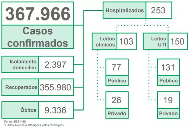 Conforme o boletim da SES, 253 pessoas estão hospitalizadas, sendo 103 em leitos clínicos e 150 em leitos de UTI (Unidade de Terapia Intensiva). Outros 2.397 contaminados estão em isolamento domiciliar e 355.980 pessoas se recuperaram, mas sem levar em consideração as sequelas da doença.