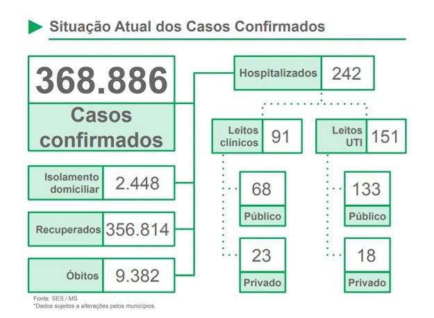 De 368.886 casos confirmados em MS, 356.814 pacientes se recuperaram. Em relação às internações, MS tem 242 pacientes internados. Destes, 91 estão em leitos clínicos (68 públicos e 23 privados) e 151 em leitos de UTI (Unidade de Terapia Intensiva), dos quais 133 estão em leitos públicos e 18 em privados.