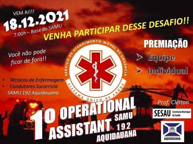 Com o objetivo de estimular os profissionais do SAMU de Aquidauana e, ainda, manter as equipes alinhadas no atendimento pré-hospitalar de qualidade em Suporte Básico de Vida às vítimas de trauma e problemas clínicos, através de atividades competitivas, será realizada, no dia 18 de dezembro, a primeira edição do Operational Assistant.