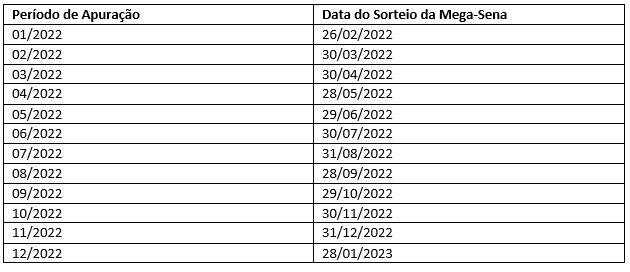 O calendário faz referência as compras e números computados de janeiro a dezembro de 2022, e as datas dos sorteios relativos a fevereiro de 2022 a janeiro de 2023. A Resolução da Sefaz (Secretaria Estadual de Fazenda) com as devidas informações foi publicada nesta quinta-feira (09) no Diário Oficial do Estado. Confira o calendário: