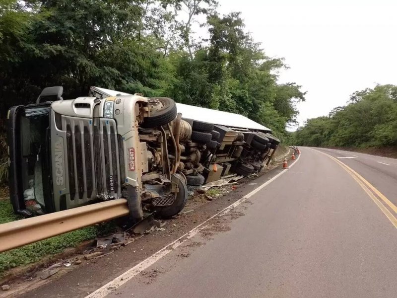 Carreta com placas de Vilhena, Rondônia, carregada de verduras e legumes, tombou neste domingo no Km 677 da BR-163, a 5 quilômetros de Rio Verde de Mato Grosso. O motorista saiu ileso do acidente.