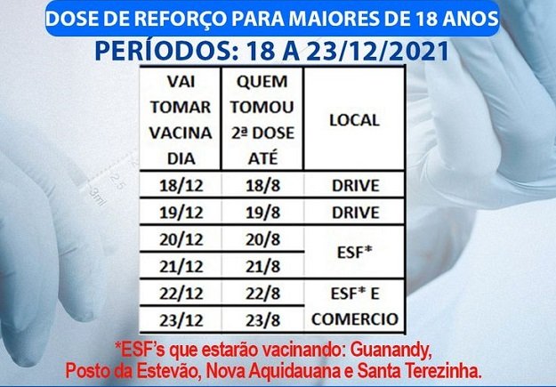 A vacinação da dose de reforço (D3), em Aquidauana, está disponível para as pessoas a partir de 18 anos, que já tenham completado 04 meses que tomaram a 2ª dose.