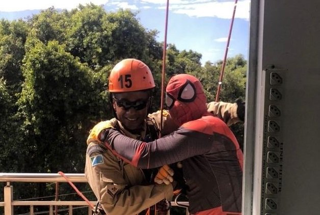 De rapel e fantasiados de super-heróis, os militares foram até a janela onde estavam as crianças para levar uma mensagem de otimismo e esperança.