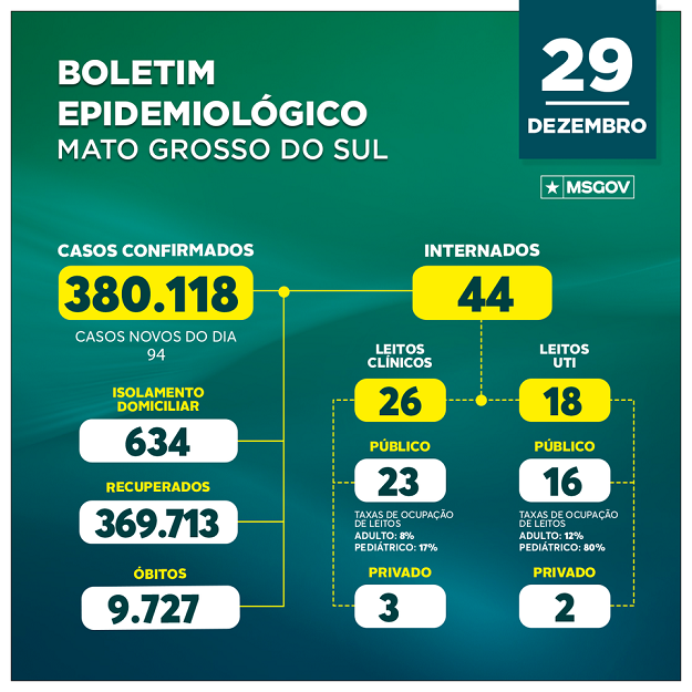 A ocupação de leitos UTI/SUS não teve muita alteração, com a macrorregião de Dourados com 63% de ocupação, Corumbá 53%, Campo Grande 47% e Três Lagoas com 34% de ocupação.