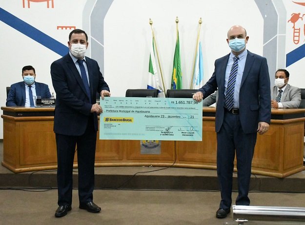 Em seguida, o presidente da Câmara de Aquidauana, vereador Wezer Lucarelli fez a entrega ao prefeito Odilon Ribeiro de um ‘Cheque Simbólico’ no valor de R$ 1.651.787,96 (Um milhão, seiscentos e cinquenta e um mil, setecentos e oitenta e sete reais e noventa e seis centavos), que representa o valor do recurso do duodécimo devolvido à Prefeitura de Aquidauana no ano de 2021.