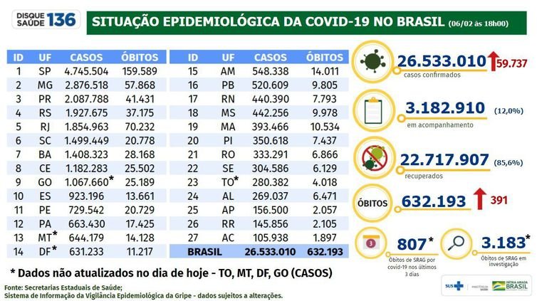 O Brasil registrou, desde o início da pandemia, 26.533.010 casos confirmados de covid-19, segundo o boletim epidemiológico divulgado neste domingo (6) pelo Ministério da Saúde. O número total de mortes pela doença é de 632.193.