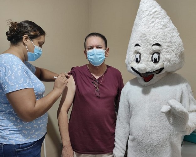 Como incentivo, o Zé Gotinha acompanhou o radialista até a Sala de Vacina dos Adultos para conferir a vacinação. “Com toda a tristeza que estamos enfrentando, com a perda de vidas por conta da pandemia, a equipe da Saúde da ESF Esf João Jorge no bairro Alto conseguiu propiciar um pouco de alegria e descontração a todos no momento da vacinação”, disse Carvalho.