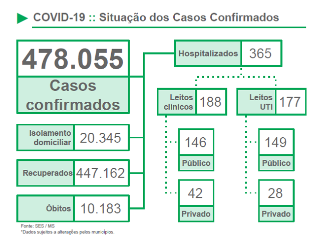 Nas últimas 24 horas a Secretaria de Estado de Saúde também recebeu a confirmação de 3.724 novos casos no Estado. Os municípios com maior número de infecções são: Campo Grande (1.584), Três Lagoas (341), Paranaíba (191), Dourados (145) e Mundo Novo (108). A média diária de casos novos na última semana está em 3.100.