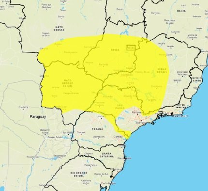 Conforme o monitoramento, o alerta de nível amarelo, com chuva de 20 a 50 mm por dia, ventos intentos de 40 a 60 km/h, acompanhada com queda de granizo, risco de corte de energia elétrica, estragos em plantações, queda de galhos de árvores e alagamentos.