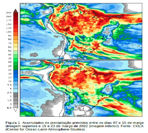Previsão estendida do Cemtec, indica que a chuva deve continuar com baixos acumulados na próxima quinzena. Até dia 15 de março há probabilidade para chuvas de moderada a forte e tempestades acompanhadas de raios e rajadas de vento, e os acumulados podem variar entre 10-70 mm devido a convergência de umidade em baixos níveis e aquecimento diurno. Além disso, o avanço de uma frente fria pode favorecer a formação de instabilidades. A região norte deve ter os maiores acumulados neste período.