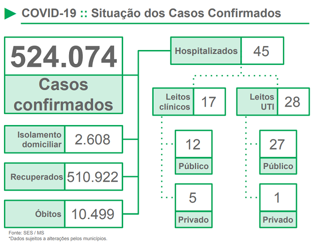 A taxa de ocupação global de leitos SUS/UTI adulto por macrorregião de internação é de 73% em Campo Grande, 61% em Dourados, 53% em Corumbá e 28% em Três Lagoas.