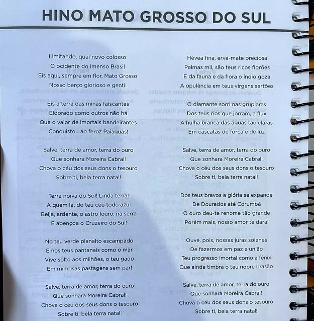 Parte das agendas entregues aos alunos dos grupos 4 e 5 da Reme (Rede Municipal de Ensino) de Campo Grande vieram com um erro de impressão. Ao invés do material conter o Hino de Mato Grosso do Sul, como está no título, a letra reproduzida é do estado do Mato Grosso.