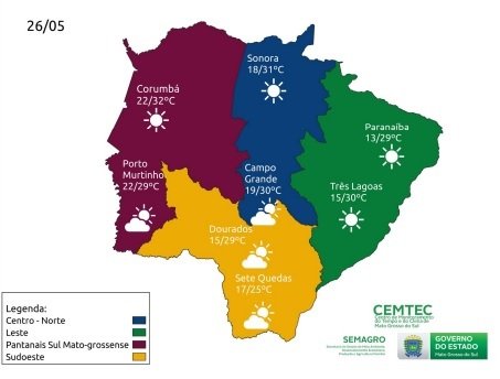 A previsão do Centro de Monitoramento do Tempo e do Clima de Mato Grosso do Sul (Cemtec) para esta quinta-feira (26) é de tempo estável, com sol e variação de poucas nuvens em todo o Mato Grosso do Sul.