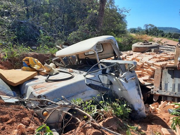 Segundo informações ocorreu no local a saida de pista de um caminhão carregado com tijolos após possivel estouro de pneu no trecho de reta em declive.