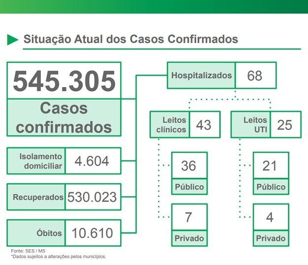 O Boletim Epidemiológico do Governo do Estado de MS mostra que 68 pessoas estavam hospitalizadas neste período, sendo 43 pacientes em leitos clínicos e 25 em leitos de Unidade de Terapia Intensiva.