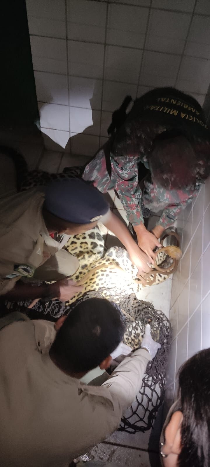 O animal foi localizado dentro de um banheiro, que estava com a porta aberta. Após o monitoramento, ele foi anestesiado. Tratava-se de um macho adulto, com aproximadamente 115 kg. No período em que estava anestesiado, os parâmetros vitais do felino também foram monitorados e não apresentaram nenhuma alteração.