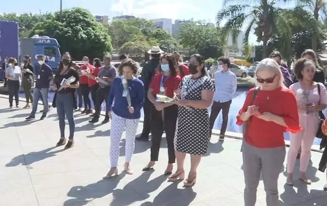A manifestação, organizada pelo sindicato dos trabalhadores, pede a "saída urgente" de Pedro Guimarães do cargo. Os participantes fazem discursos contra o gestor e entregam flores a funcionárias que entrar ou saem do prédio.