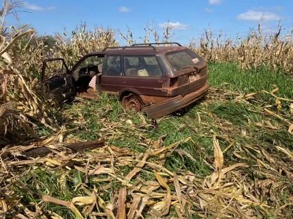 O condutor, um idoso de 70 anos, perdeu o controle do automóvel quando o pneu traseiro estourou, o carro caiu em um barranco, bateu em vários postes da cerca e parou em uma plantação de milho.