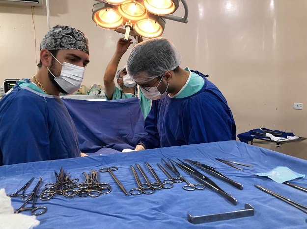 Foto publicada nesta matéria registra uma cirurgia de hernioplastia realizada pelo médico-cirurgião André Rueda e equipe, em um paciente de 78 anos, morador de Bandeirantes-MS.