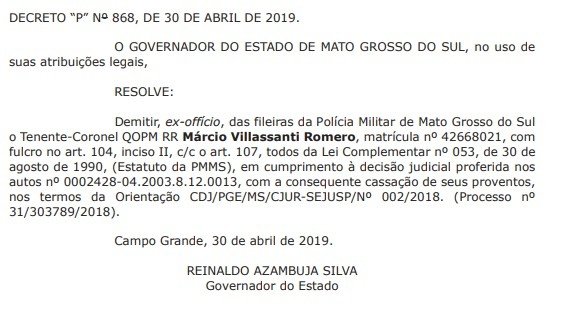 Condenado por estupro, o tenente-coronel Márcio Villasanti Romero foi demitido da PM (Polícia Militar). A demissão é assinada pelo governador Reinaldo Azambuja (PSDB) e foi divulgada na edição de hoje do Diário Oficial do Estado.