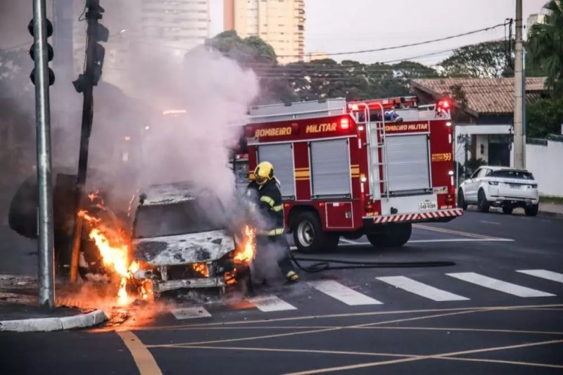 Um veículo Fiat Strada acabou destruído pelo fogo, na manhã desta quinta-feira (21), na região central de Campo Grande. As chamas chegaram a 3 metros de altura. Equipes do Corpo de Bombeiros foram deslocadas para o local.