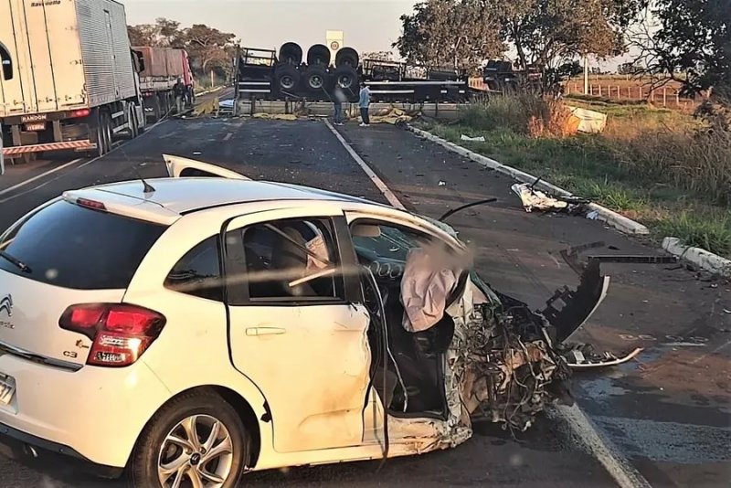 Por causa do impacto da batida, o carro teve as partes frontal e lateral danificadas. Já a carreta tombou, ficando com as rodas para cima, com parte na pista. Ninguém ficou ferido com gravidade. A PRF (Polícia Rodoviária Federal) foi acionada para o local.