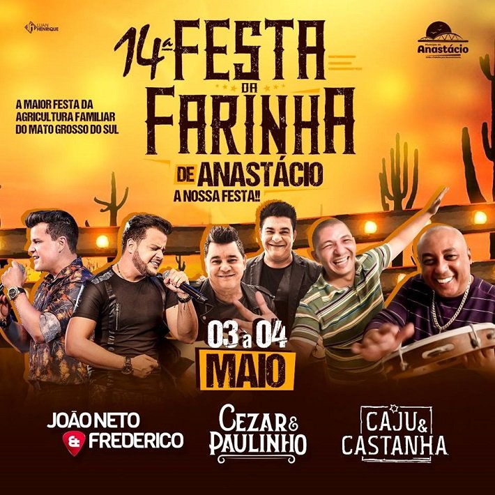 Com prato cheio da boa culinária e a tradição nordestina, a 14ª Edição da Festa da Farinha terá início no próximo final de semana em Anastácio! Considerada a maior festa da Agricultura Familiar de Mato Grosso do Sul, o evento tem a importância socioeconômica, já que é realizada por produtores da Agricultura Familiar da região e conta com shows nacionais para animar a população. Os repentistas Caju e Castanha, e os sertanejos Cezar e Paulinho, João Neto e Frederico estão na programação da festa que começa amanhã, sexta-feira (3) e termina no sábado (4), na Praça Arandú e é gratuita.