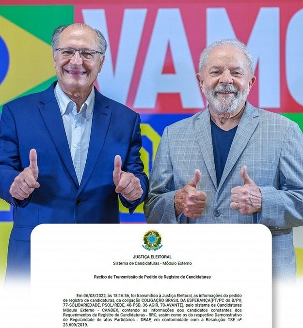 Lula e Alckmin serão candidatos pela Coligação Brasil da Esperança, composta pela federação PT-PV-PCdoB, pela federação PSOL-REDE, pelo PSB, pelo Solidariedade, pelo Avante e pelo Agir. Ao todo, nove partidos integram a coligação, que será a maior entre todas em disputa e, por isso, também deve contar com o maior tempo de campanha em rede nacional de rádio e televisão.