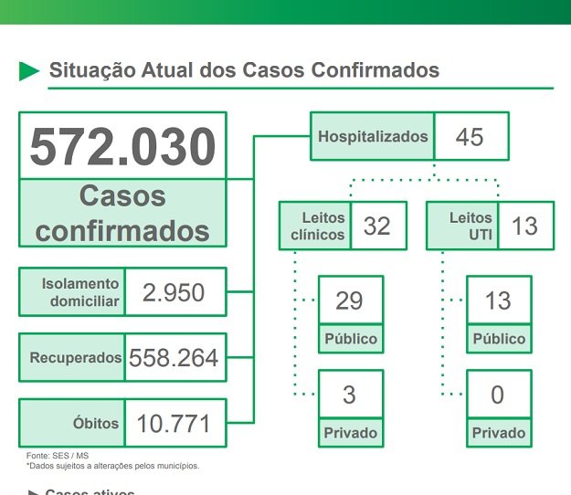 Desde o início da pandemia, mais de 572 mil casos foram confirmados em território sul-mato-grossense. Desses, 558,2 mil se recuperaram, mas 10,7 mil morreram. Atualmente, 2,9 mil estão em isolamento domiciliar e 45 estão hospitalizados.