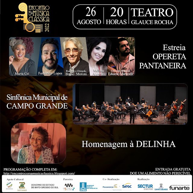Considerado o festival de música de concerto mais importante do Estado, esta edição terá concertos de orquestras acompanhados de coros e solistas (de ópera e popular), além da apresentação de obras inéditas de compositores locais, como a “Opereta Pantaneira”, fruto da parceria com a Orquestra Sinfônica Municipal de Campo Grande.