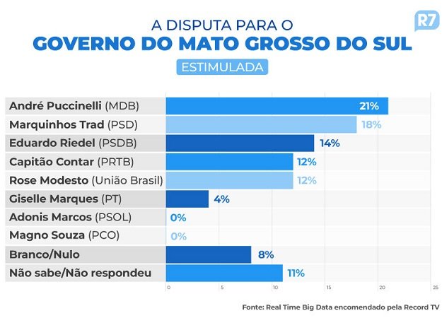 Puccinelli e Trad estão tecnicamente empatados, com 21% e 18% das intenções de voto, respectivamente. A diferença na pesquisa estimulada (em que os nomes dos candidatos são apresentados aos entrevistados) é de três pontos percentuais para mais ou para menos e, portanto, está dentro da margem de erro.