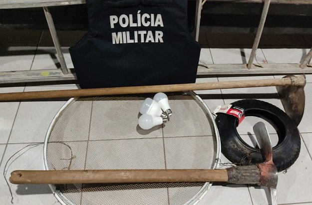 Ao perceber a viatura, o autor correu e se escondeu em um terreno baldio, e após buscas, foi localizado deitado no mato juntamente os objetos, uma enxada, uma picareta, um pneu de carrinho de mão, uma escada de alumínio, uma peneira de pedreiro e três lampadas de led.