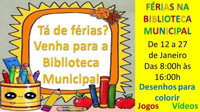 A Secretaria Municipal de Cultura e Turismo por meio da Biblioteca Pública Municipal Francisco Alves Corrêa a partir de amanhã (12) até o dia 27 de janeiro, no horário das 8h às 16h, oferecerá o projeto Férias.