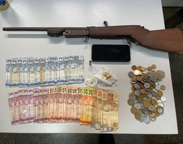Durante a prisão em flagrante, foi localizada uma arma de fogo, calibre .38, uma munição, R$ 376,00 em cédulas trocadas e moedas, além de porções de crack já prontas para a venda, guardadas em uma fralda descartável de criança.
