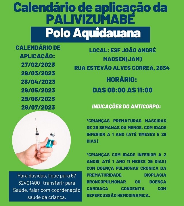 A Prefeitura de Aquidauana por meio da Secretária Municipal de Saúde e Saneamento Básico (SESAU) divulga o calendário de aplicação do imunizante Palivizumabe.