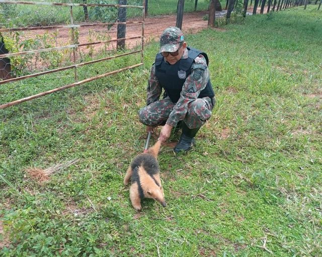 Campo Grande (MS) – Policiais Militares Ambientais de Jardim capturaram um animal silvestre da espécie Tamandua tetradactyla (Tamanduá-mirim) ontem no domingo (19) à tarde, em um sítio, localizado no município de Guia Lopes da Laguna.