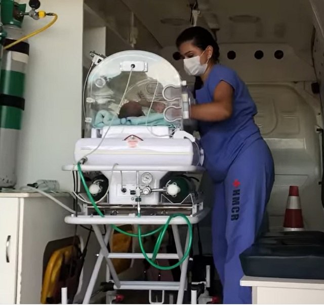 O recém-nascido foi removido em incubadora neonatal de transporte, que mantém as condições de temperatura da criança dentro dos padrões, através do sensor de temperatura, garantindo a preservação da saúde do bebê.