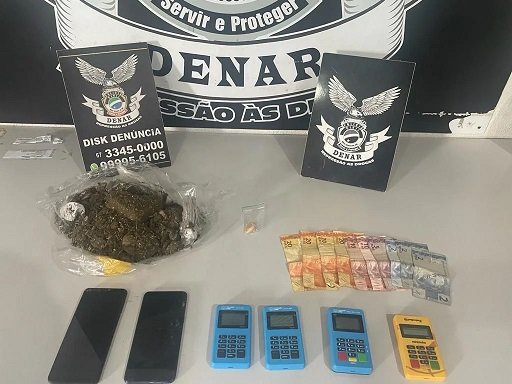 Com a confirmação do crime, foi realizada a incursão no endereço alvo da investigação e abordado um casal R.F.S., 29 anos (homem), e H.D.C.S, 33 anos (mulher). Após vistoria no local, foram localizadas maconha e pasta base de cocaína no interior do imóvel. Além dos entorpecentes, foram apreendidos R$ 111,00, em espécie, e quatro máquinas de cartão de crédito.