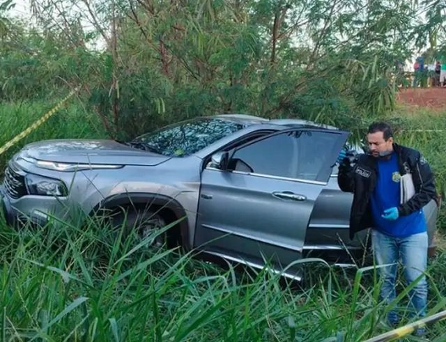 No local, a picape foi encontrada ainda ligada, com os vidros abertos e havia marcas de perfurações de arma de fogo na janela, do lado esquerdo do condutor, e na dianteira do veículo.