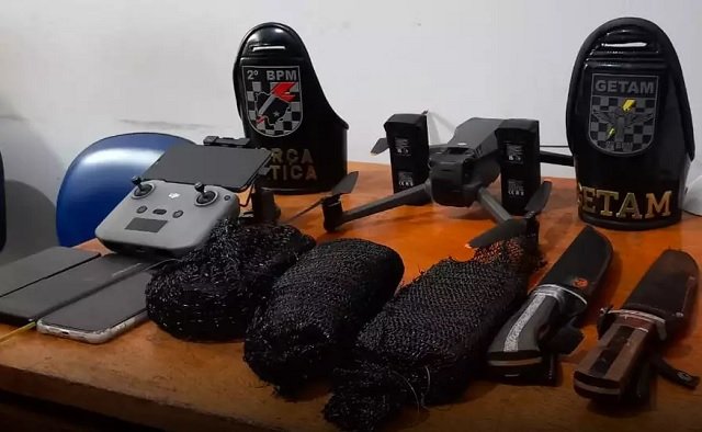 Além do drone, foram localizados onde ocorreu o confronto: duas facas, 1.2 kg de maconha, três celulares, dois carregadores portáteis, porta carga para drone, duas baterias para o drone, dois revólveres, calibre 38 e 32.