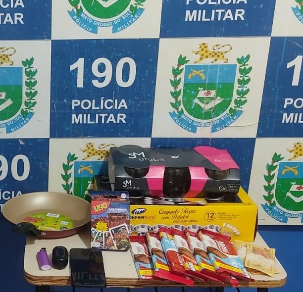 Durante a abordagem e busca pessoal, no interior da mochila do homem de 27 anos foi encontrado diversos objetos furtados da loja, sendo eles: 06 tabletes de chocolate, 01 jogo de baralho e 01 frigideira.