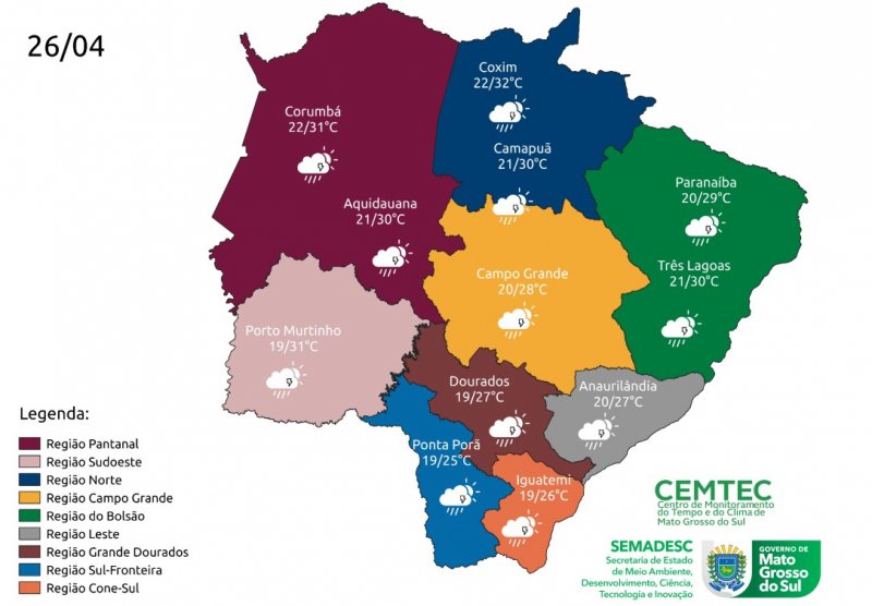 A previsão do Cemtec (Centro de Monitoramento do Tempo e do Clima) para esta quarta-feira (26) indica tempo instável, com probabilidade de chuvas de intensidade fraca a moderada em Mato Grosso do Sul.