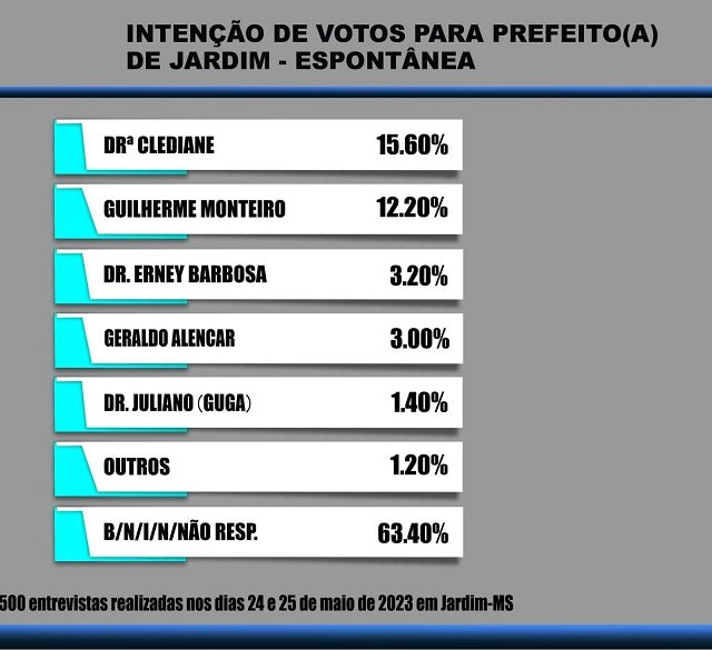 A pesquisa apontou que a prefeita de Jardim, Dra. Clediane, é considerada boa ou ótima para 36% da população. Além disso, 31,4% dos entrevistados consideram a gestora municipal como regular, 25,2% como ruim ou péssima e 7,4% não sabem ou não responderam.