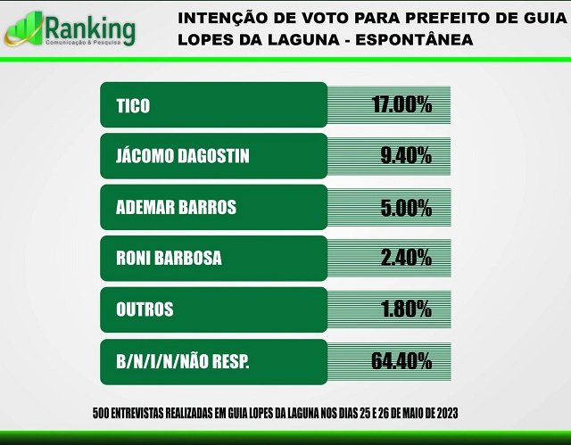 Sob encomenda do site Diário MS News, o Instituto Ranking Brasil Inteligência realizou uma pesquisa de avaliação administrativa e intenção de votos para a Prefeitura de Guia Lopes da Laguna nas eleições de 2024.